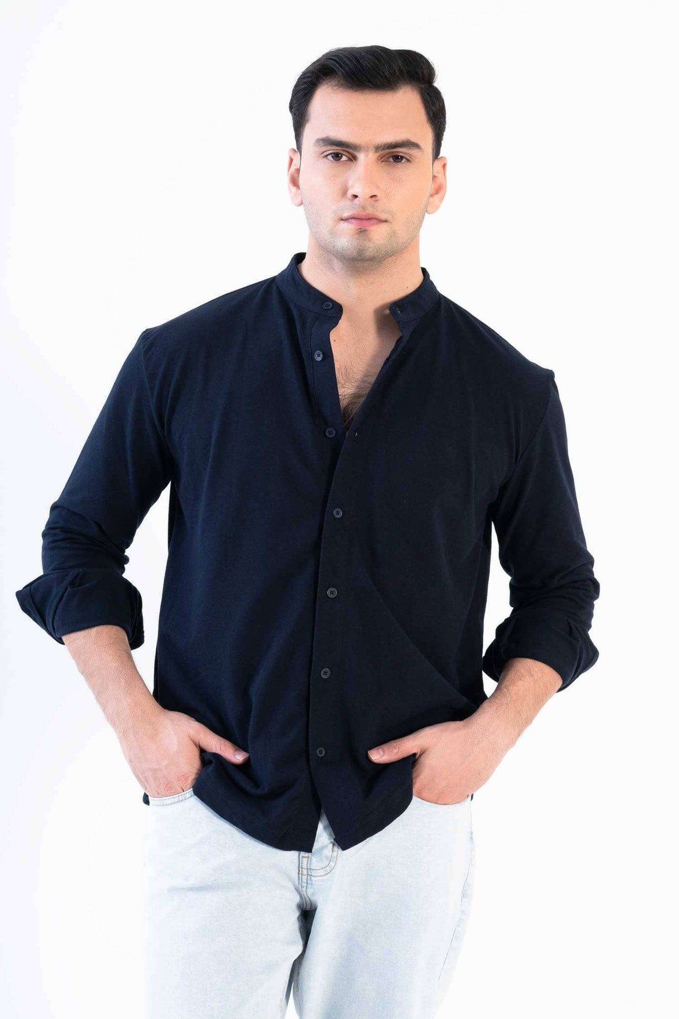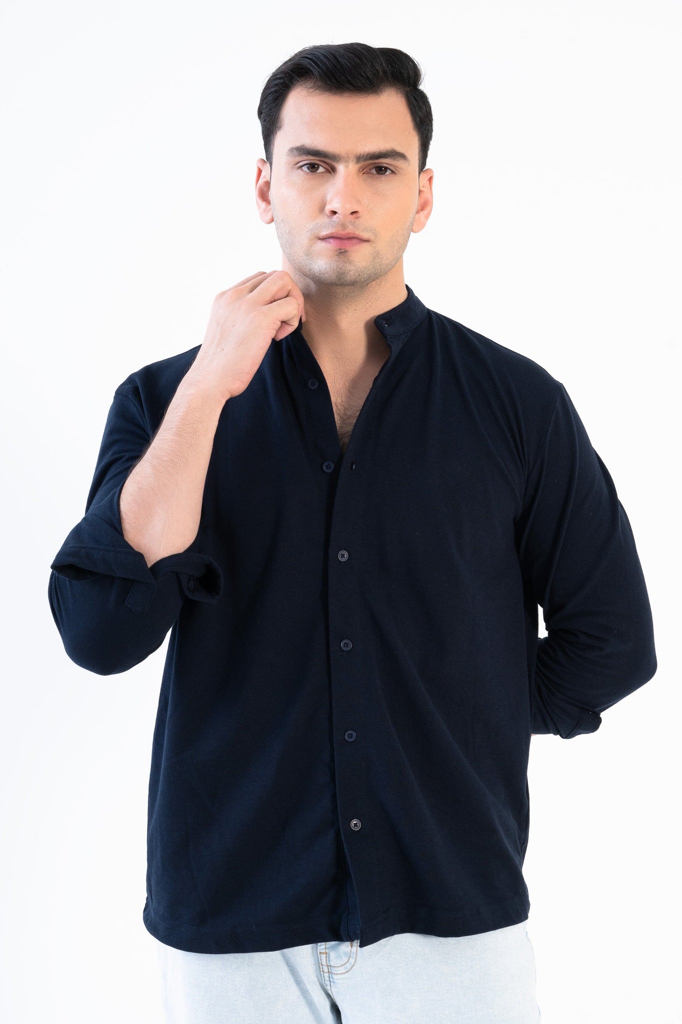 Mandarin collar and button-down design for a sleek, contemporary look