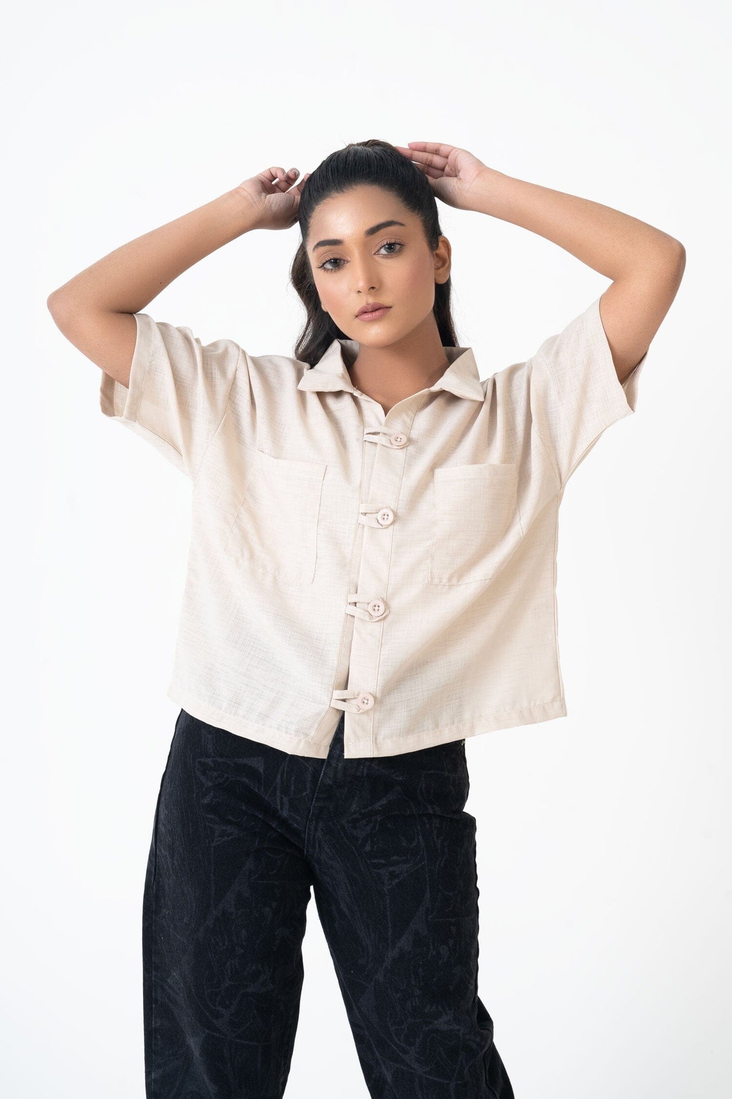 Step into style and comfort with the East West Boxy Fit Crop Shirt, a perfect blend of contemporary design and versatile functionality.