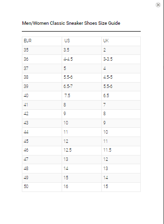 Men/Women Classic Sneaker Shoes Size Guide